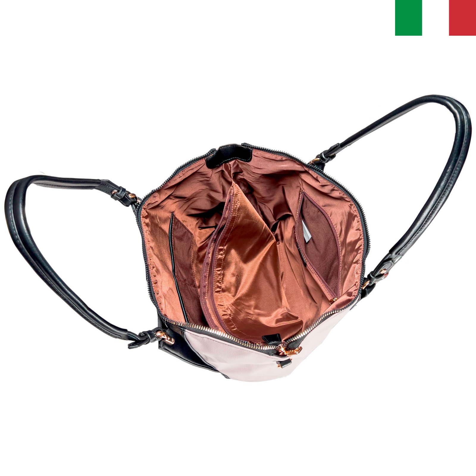 • Чантата е изработена от висококачествена еко кожа в Италия. Има интересен дизайн комбинация от два цвята. Две основни дръжки за носене на рамо и допълнителна регулируема дълга дръжка. Размерът е за дами, с афинитет към големите чанти.