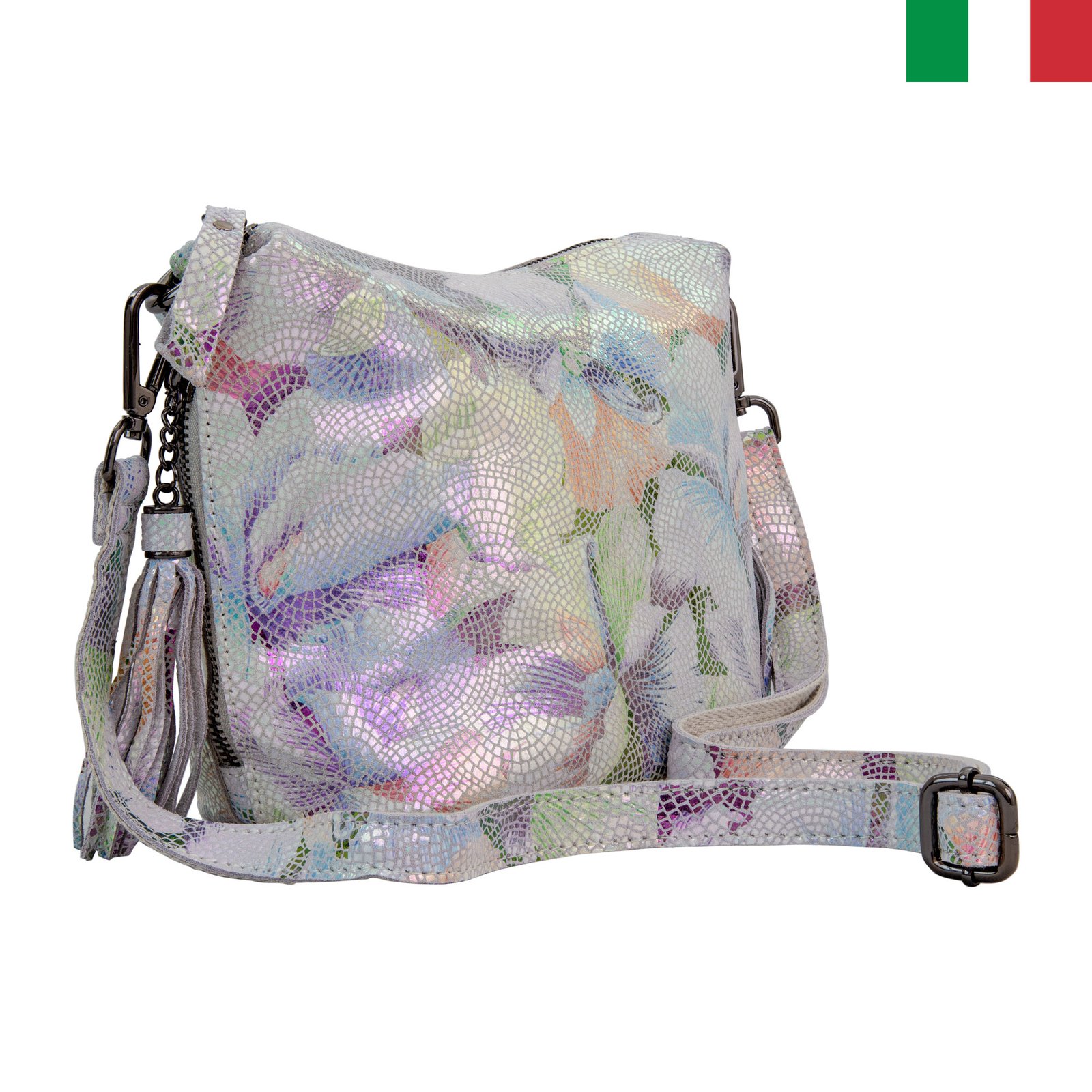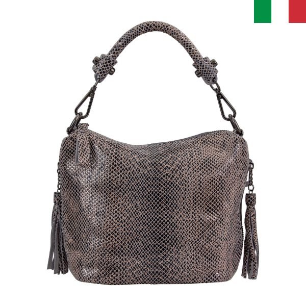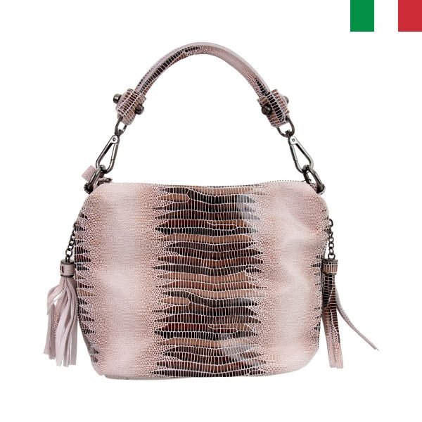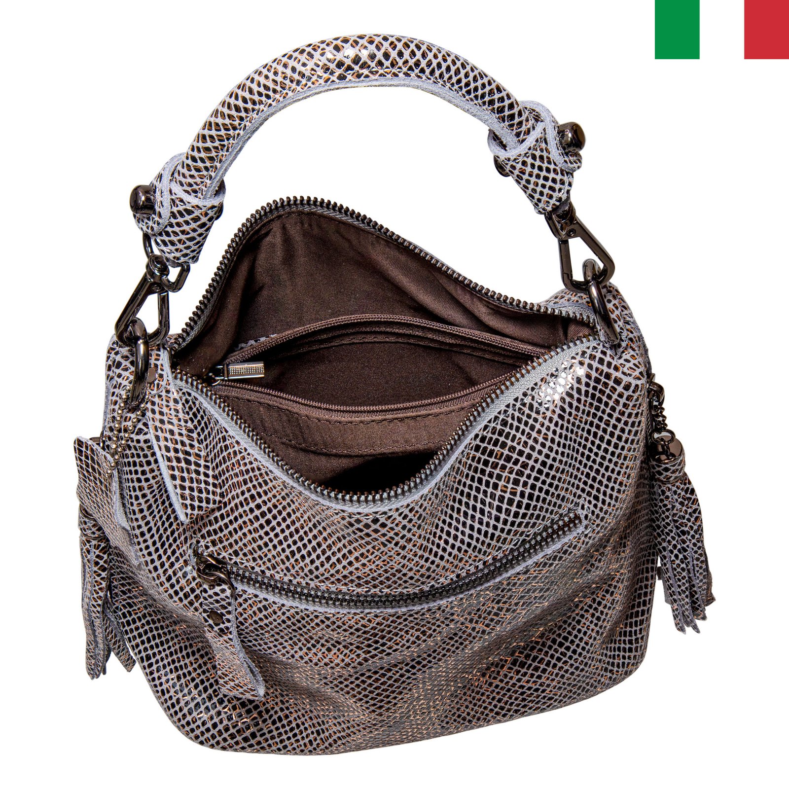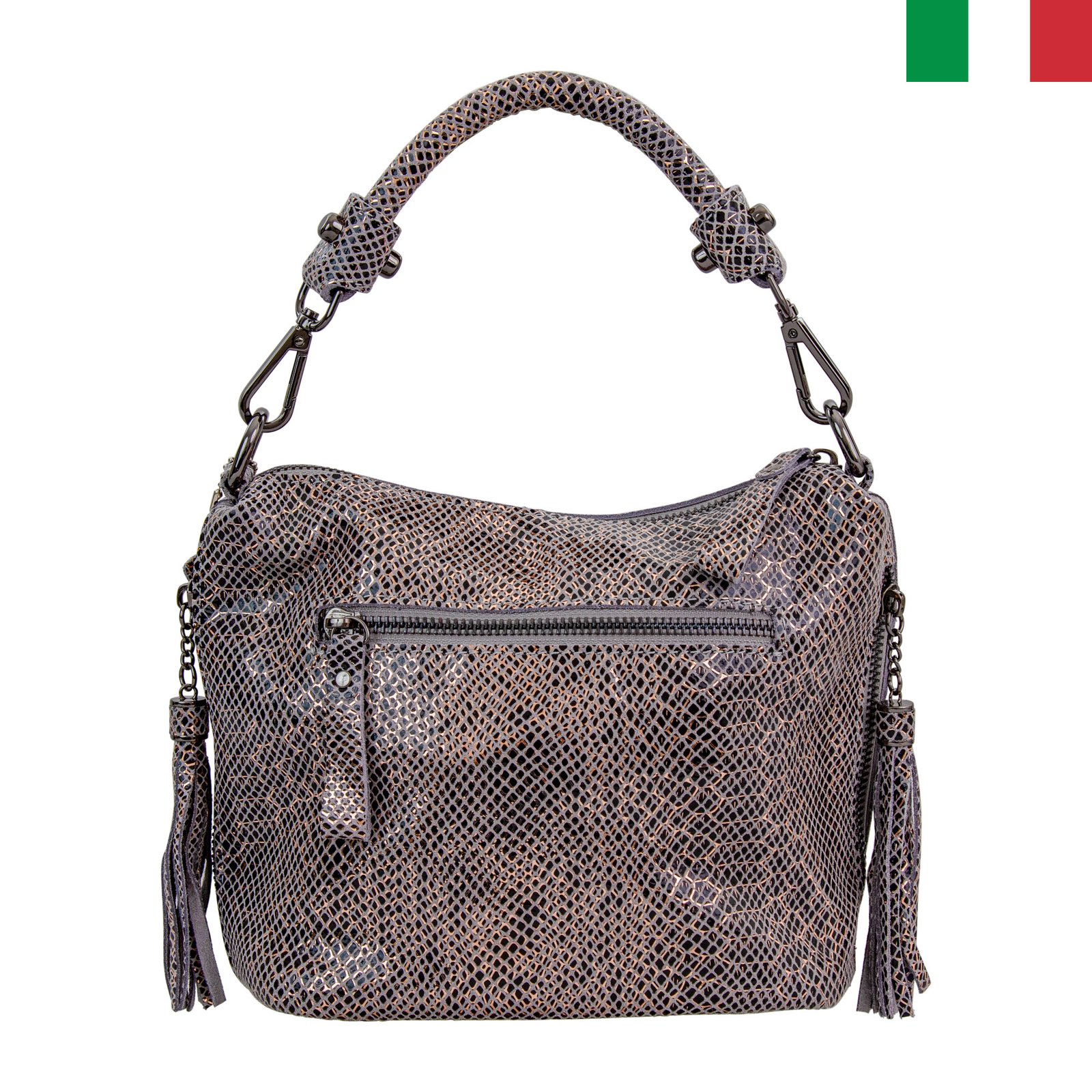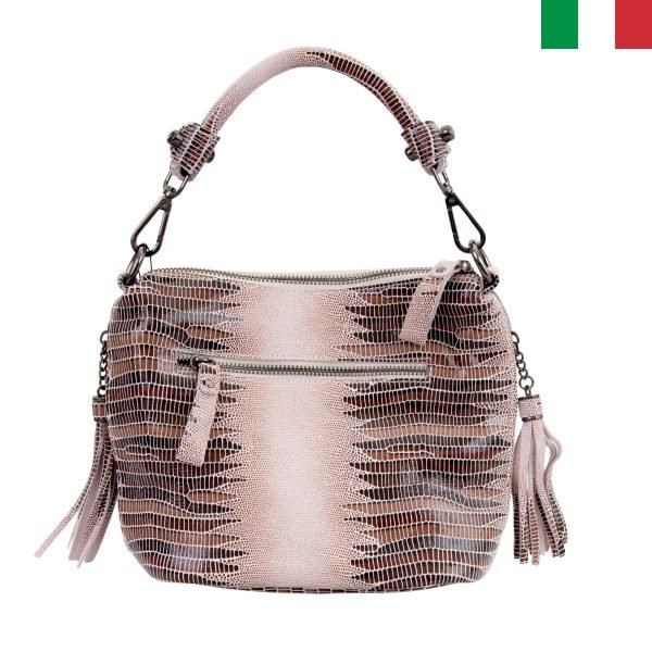 - За дамите със стил и неподражаем вкус, които предпочитат по-малки чанти, но също толкова практични и удобни! Чантата е изработена от висококачествена естествена кожа обработена с лазер, произведена в Италия. Моделът се предлага в различни кожи, като всяка от тях е с лазерна обработка. Страхотен аксесоар към Вашата визия. Чантата е с къса дръжка за носене в ръка и дълга регулируема дръжка за носене през тялото, и двете дръжки могат да се премахат и поставят. Има едно основно отделение, затварящо се с цип, две джобчета отстрани с ципове и пискюли в същата кожа, които допълват визията, джоб на гърба с цип.