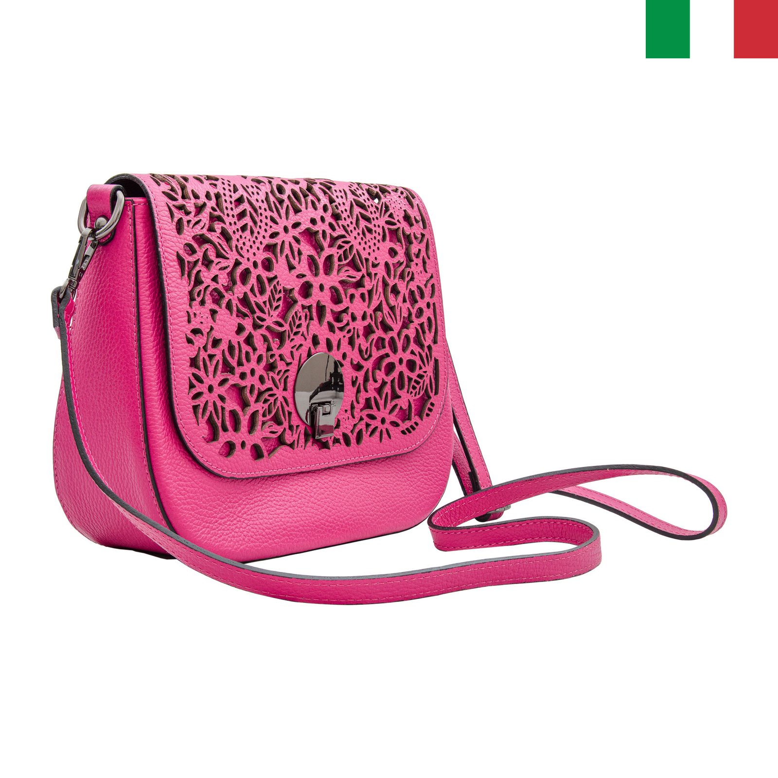 - Красива дамска чанта с изрязани орнаменти на капака, изработена изцяло от висококачествена естествена кожа, произведена в Италия. Моделът е стилен и нежен! Има две различни дръжки, които могат да се поставят или премахнат, в зависимост от Вашата нужда. Едната дръжка е къса, с нея чантата се носи на рамо, другата е регулируема, дълга – с нея чантата се носи през тялото. Чантата е с едно отделение, затварящо се с цип и капак с метално въртящо копче.