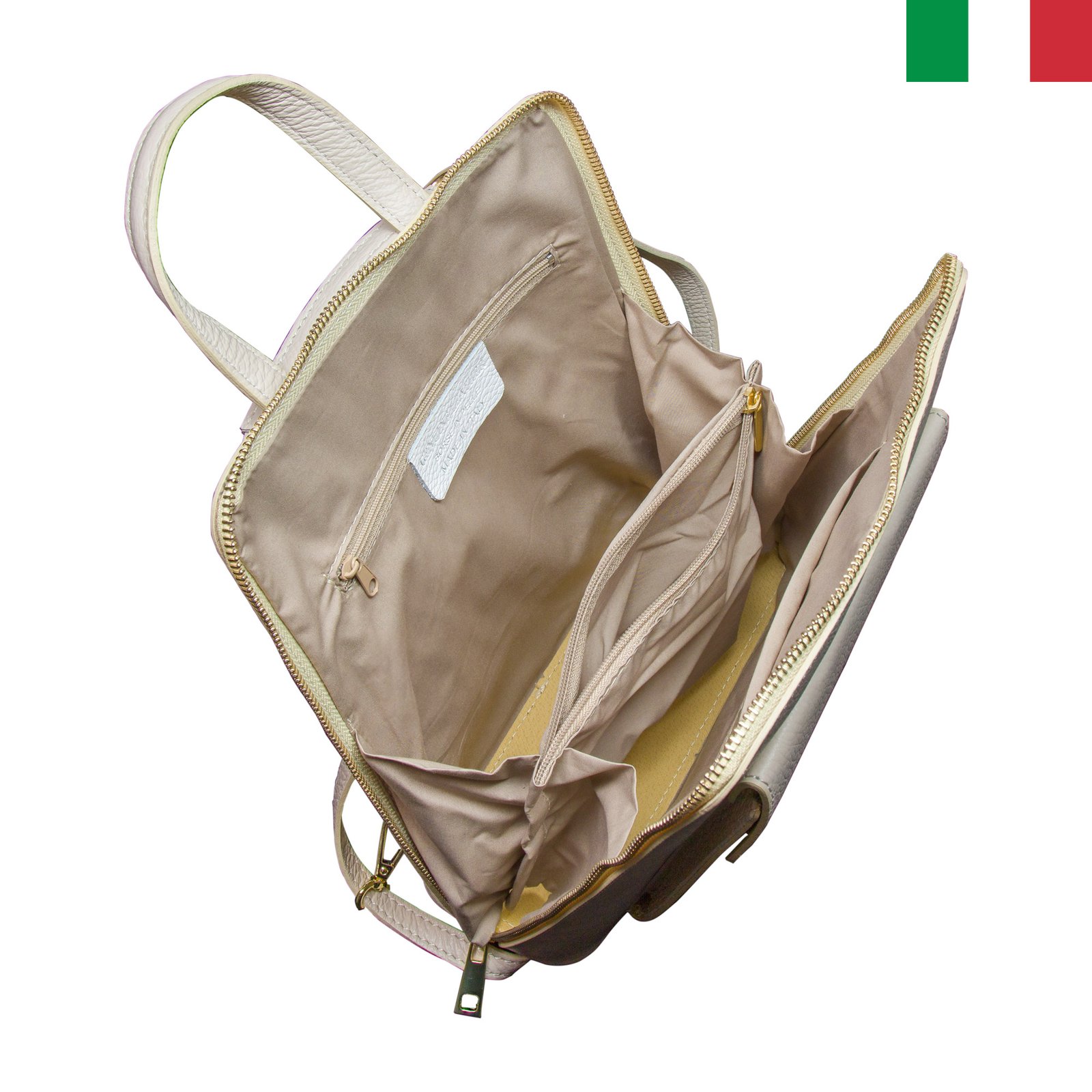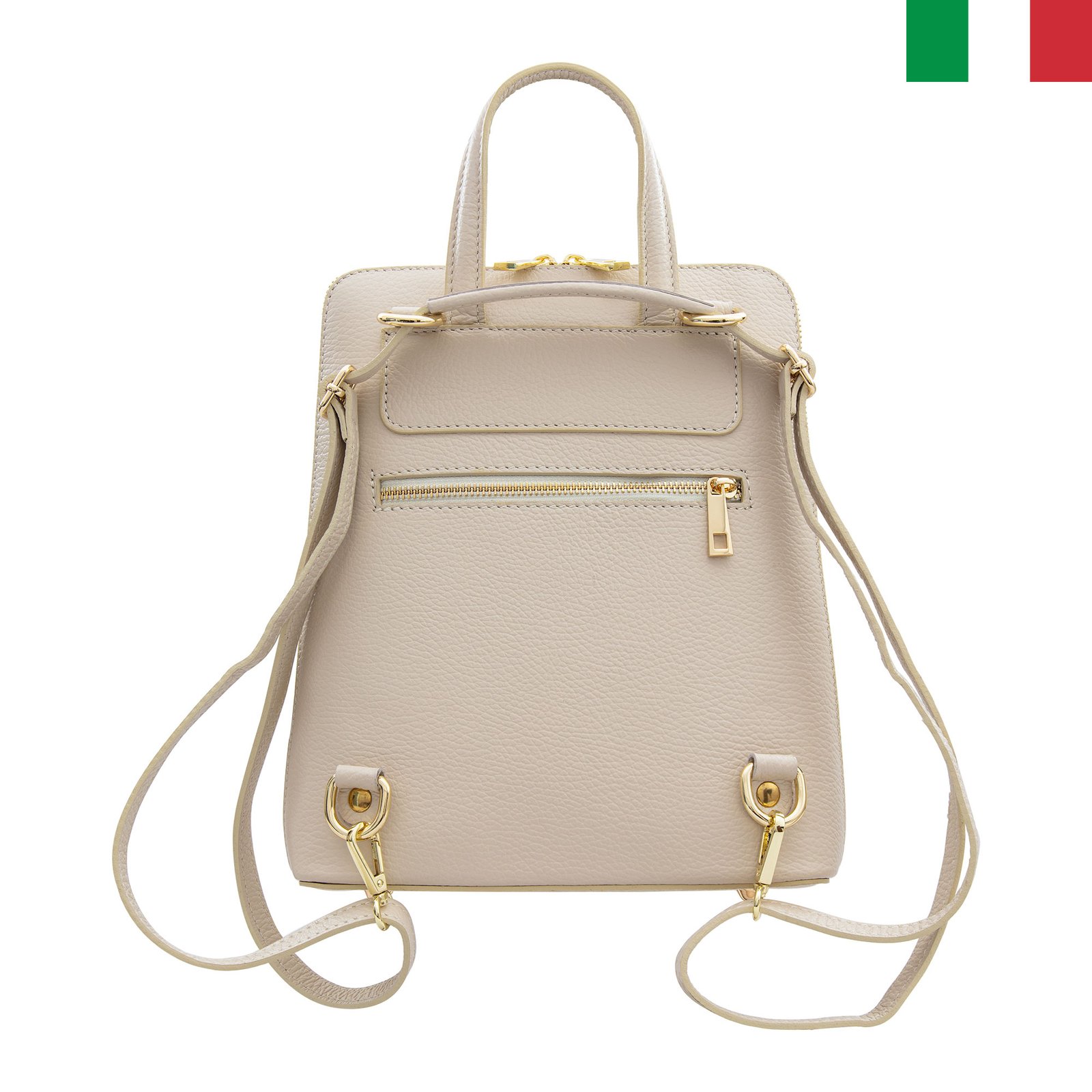 • Стилна дамска раница/чанта, изработена изцяло от висококачествена естествена кожа, произведена в Италия. Раницата е компактна и практична. Издърпването на дръжките позволява  да се превърне в чанта. Минималистичен дизайн с едно главно отделение, което се отваря по целият овал на раницата; ефектен джоб с капак отпред и  практичен заден джоб.