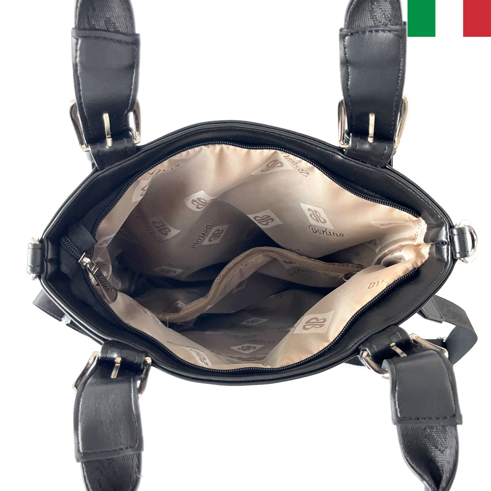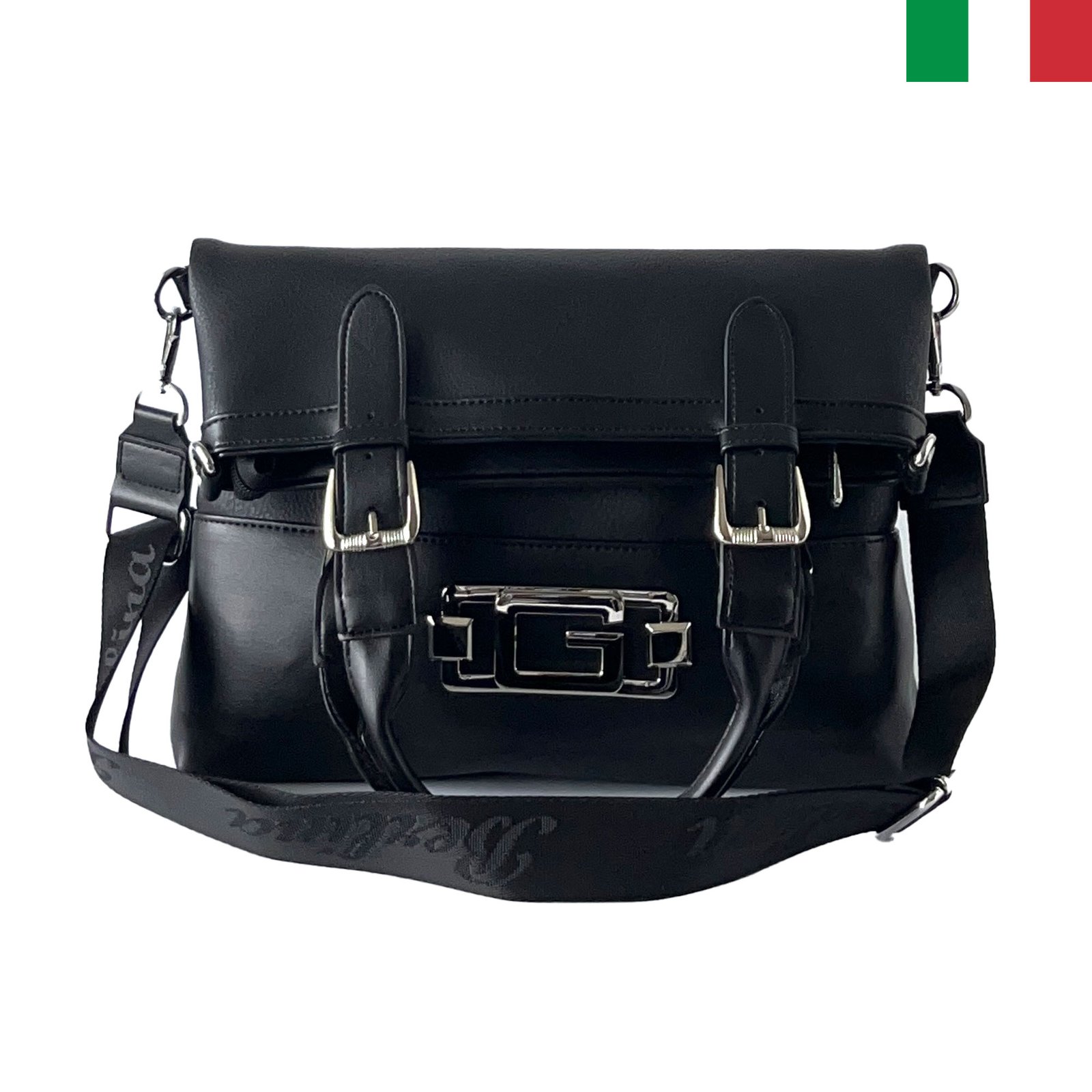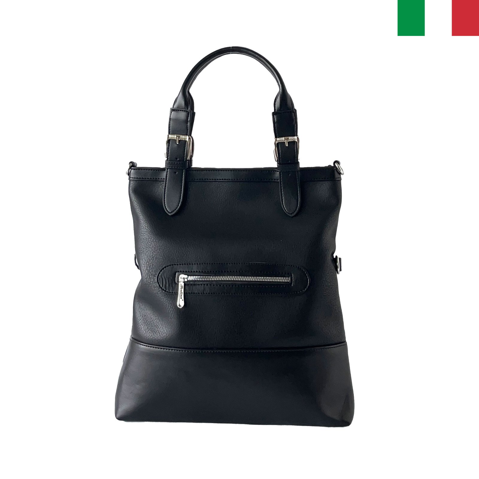 • Чантата е изработена от висококачествена еко кожа, може да се носи по няколко начина: с двете къси дръжки или като се постави допълнителна дълга текстилна, регулируема дръжка. При поставена дълга дръжка, чантата се прегъва в средата и се превръща в по-спортен модел, който да се носи през тялото.