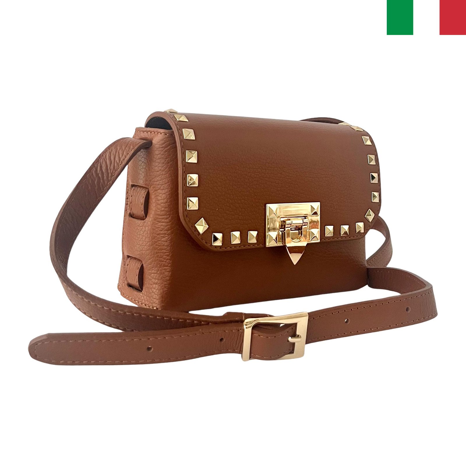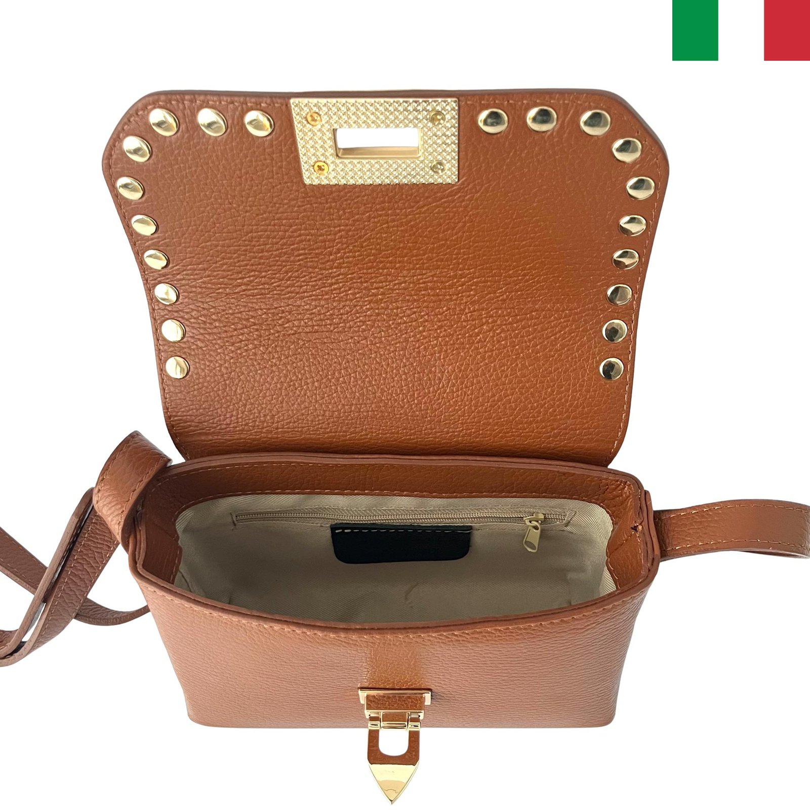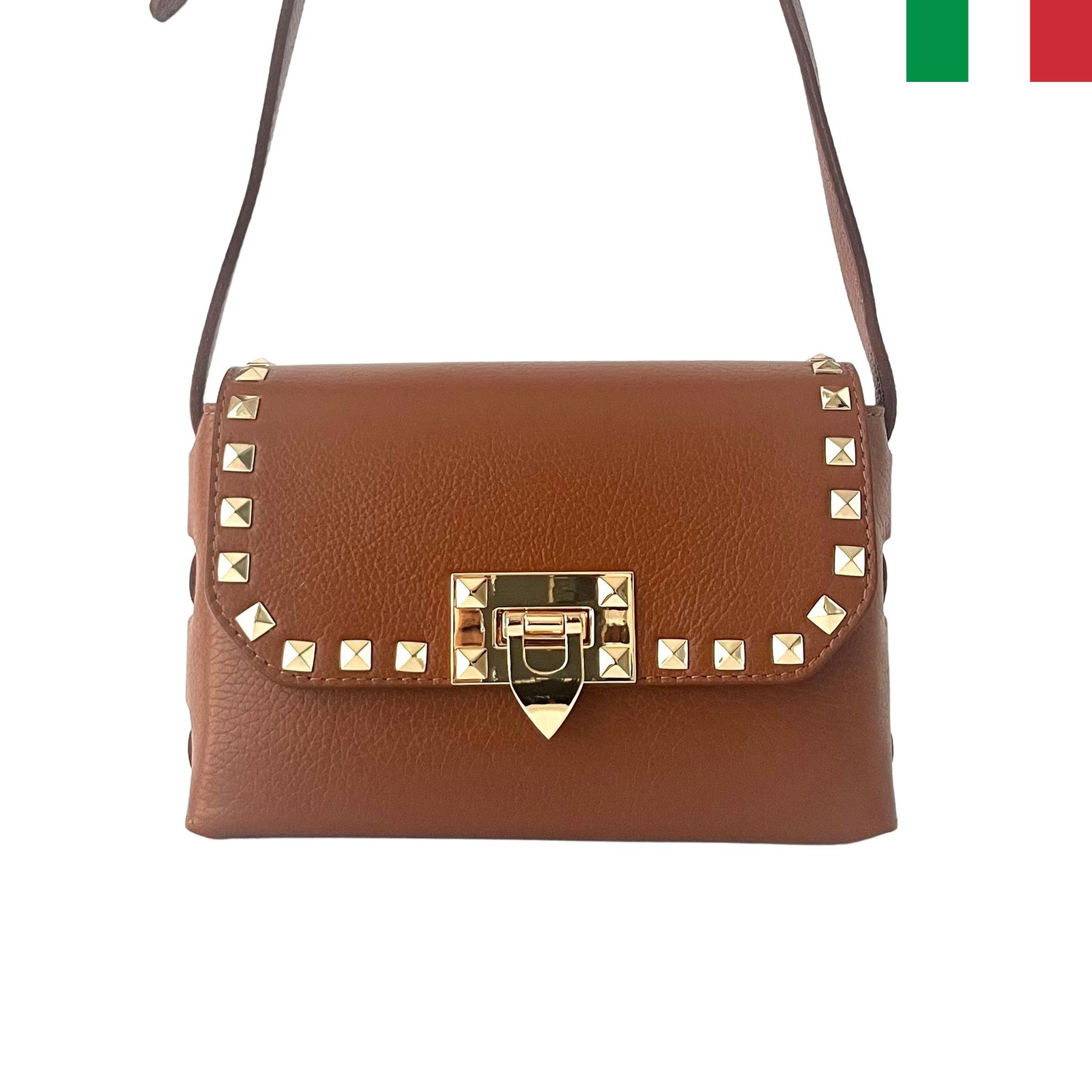Модерна дамска от естествена кожа чанта с капси – кафяв