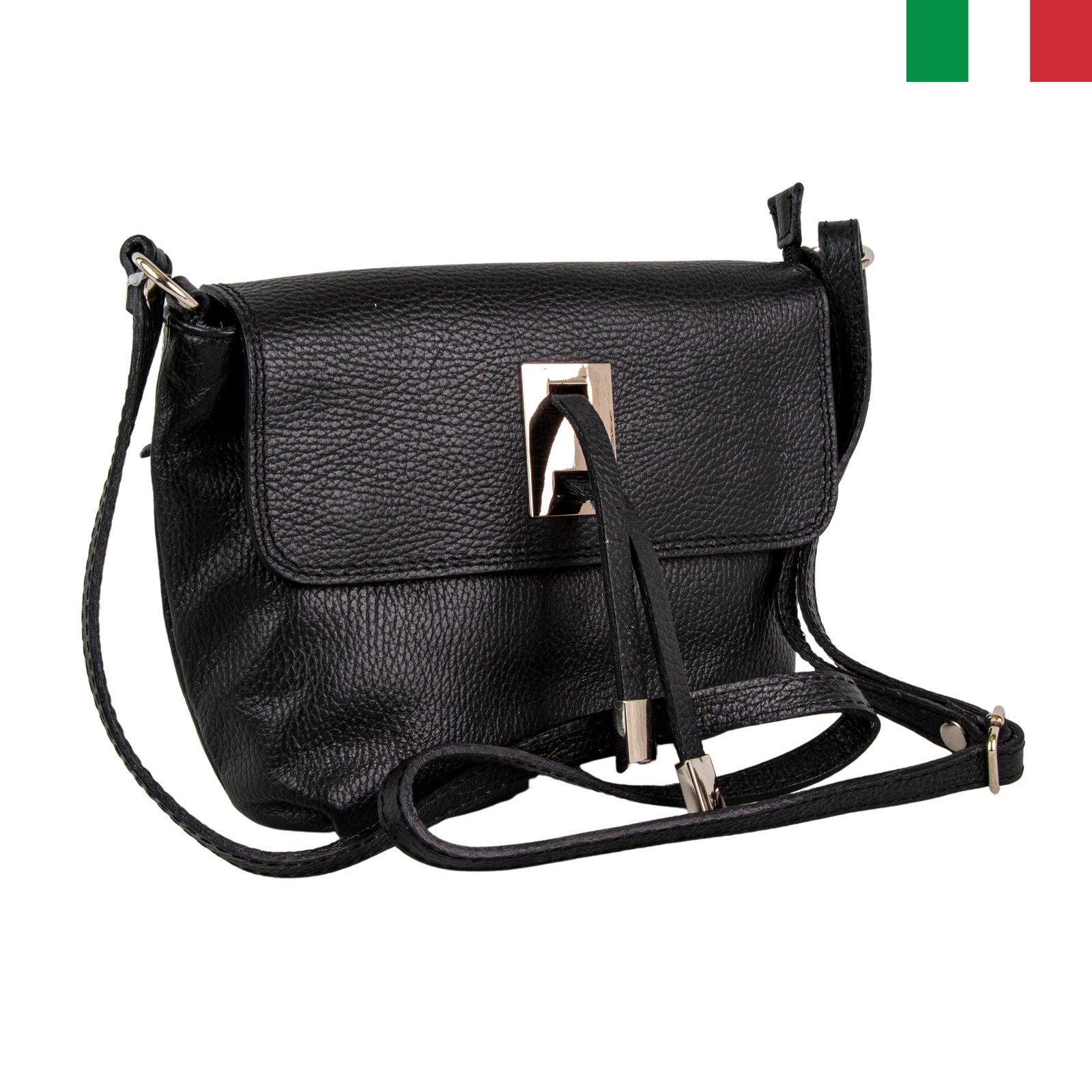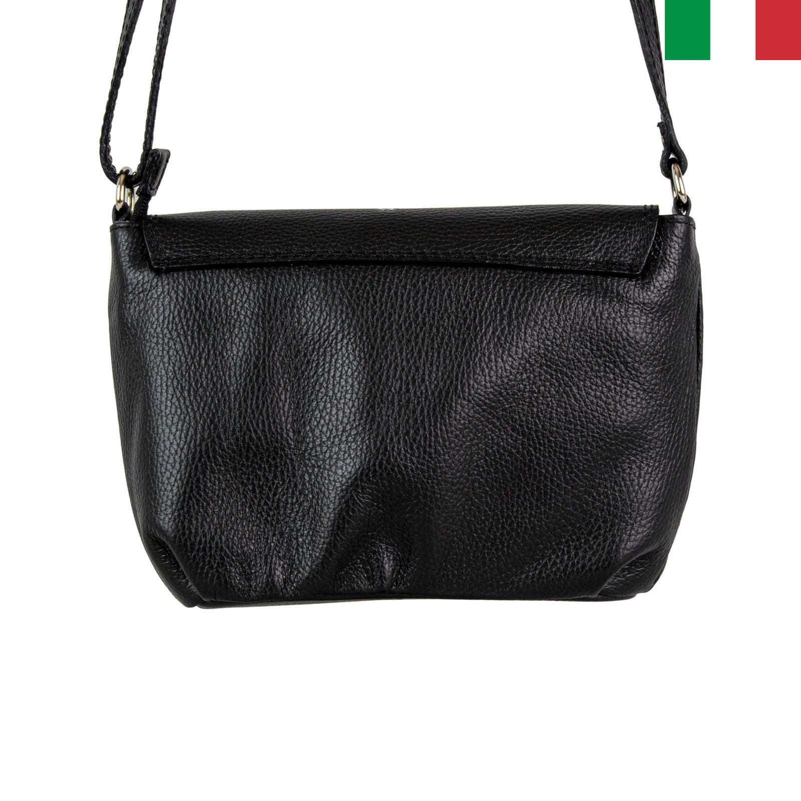 Малка дамска чанта от естествена кожа с капак с висулки – цвят черен