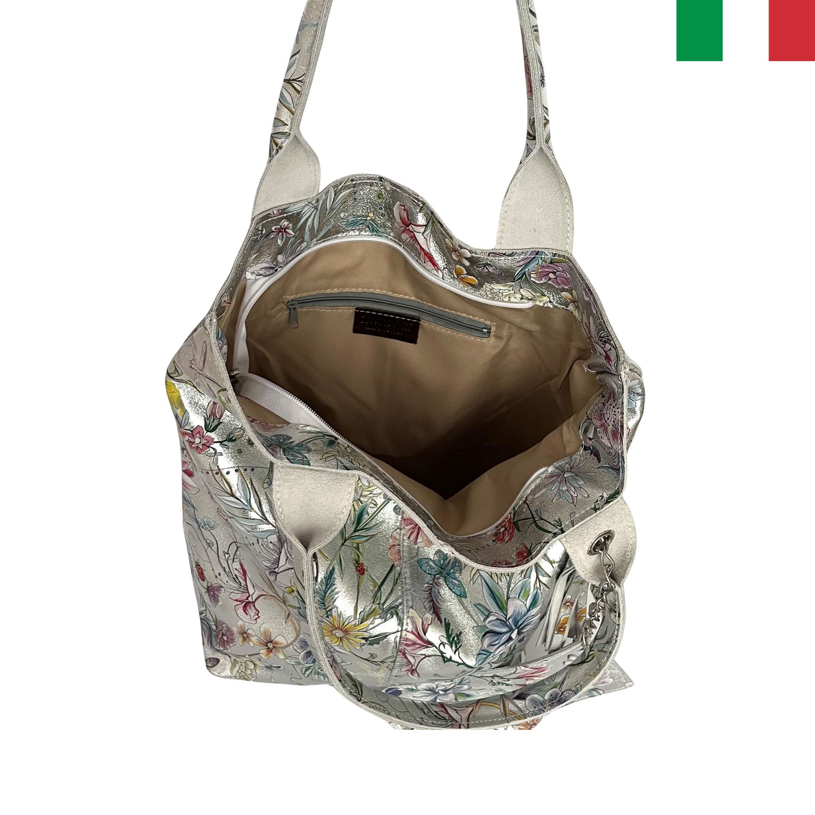 Голяма дамска чанта тип торба – цвят флорален-сребро