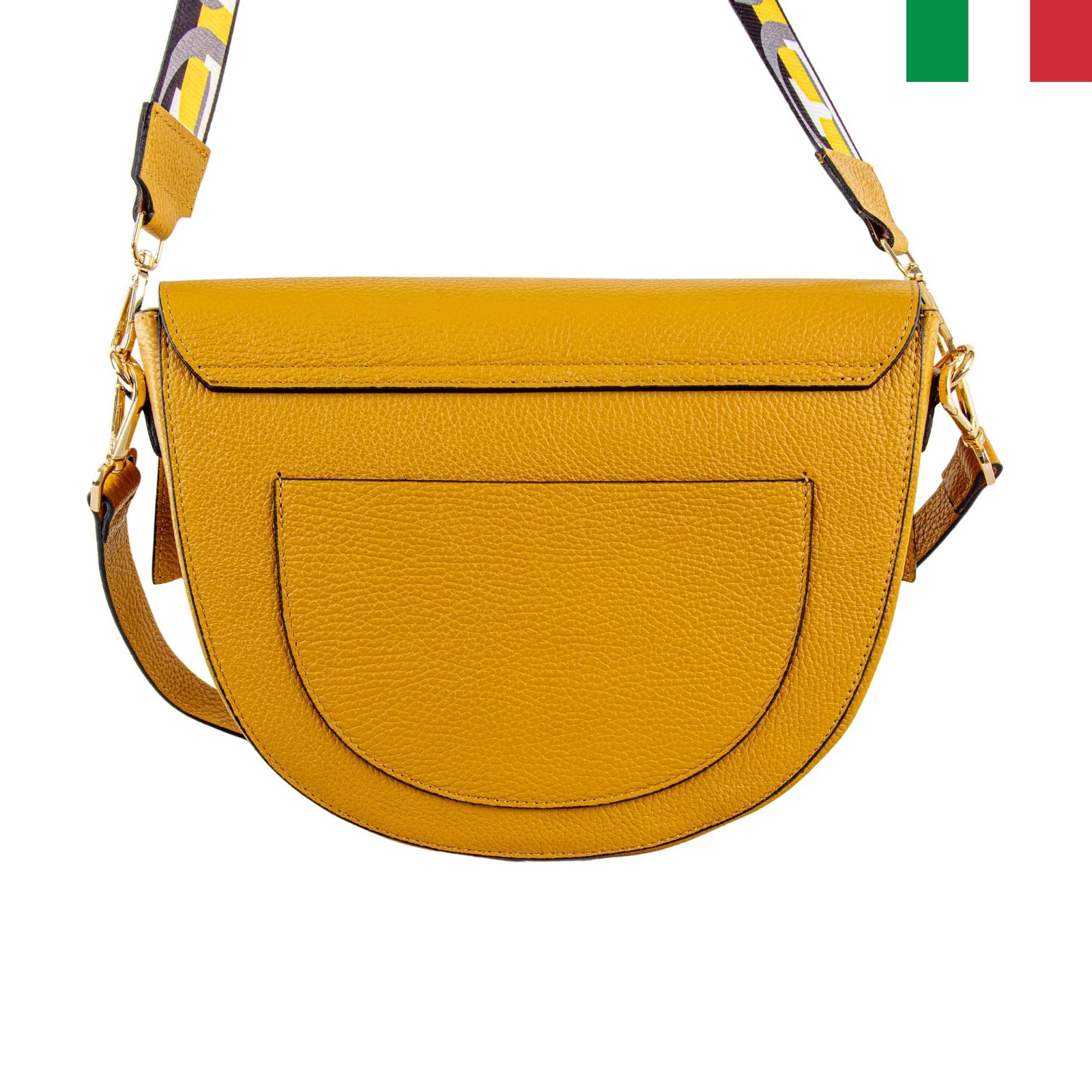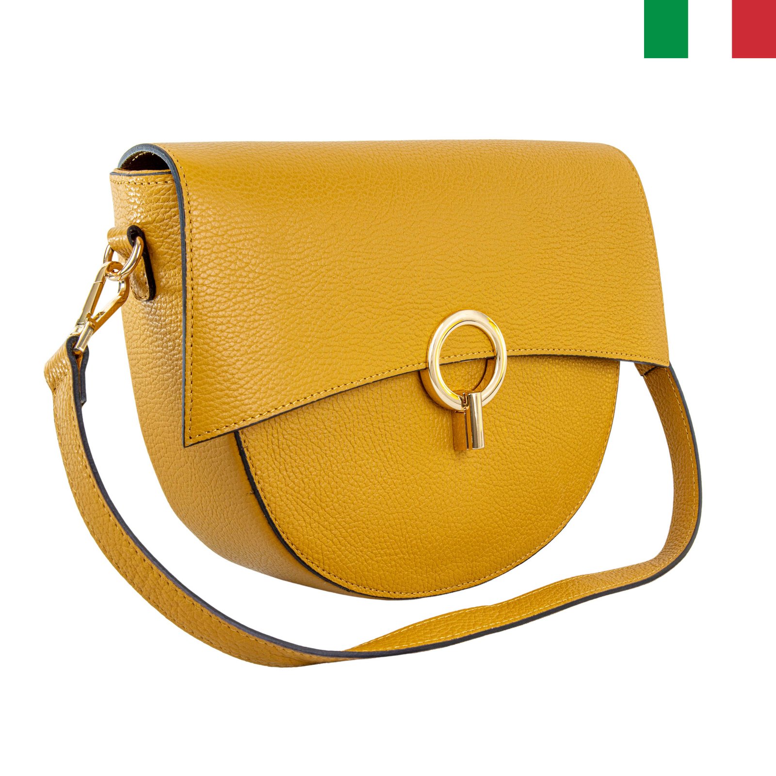 Дамска чанта от естествена кожа с капак и кръгла метална закопчалка – горчица