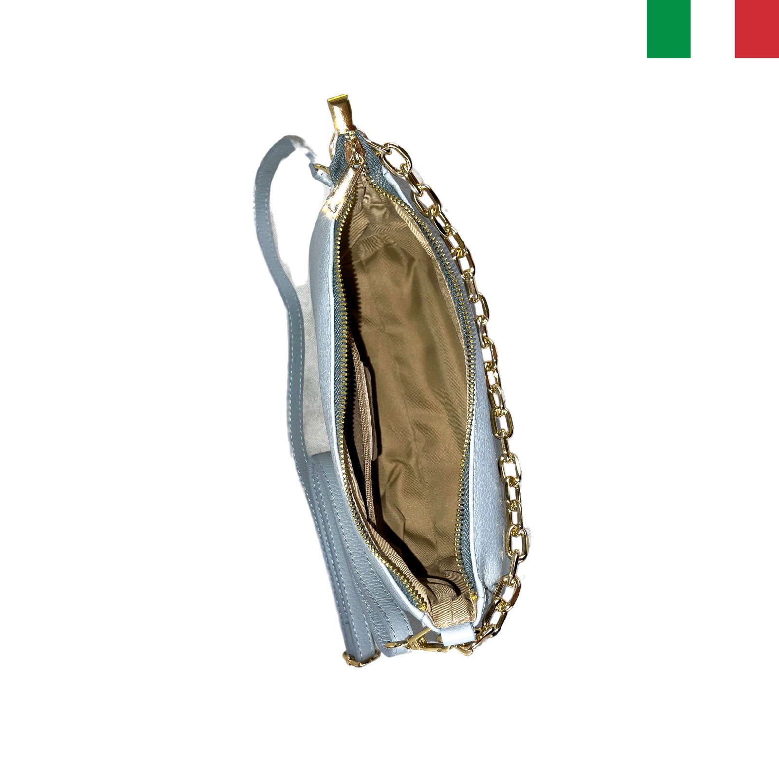 - Стилна и изключително модерна ще е визията Ви с тази чанта! Изработена изцяло от висококачествена естествена кожа в Италия. Чантата е със стилен, изчистен дизайн, а синджирът отпред придава модерен акцент. Чантата е с къса кожена дръжка за през рамото и дълга регулируема дръжка за през тялото.