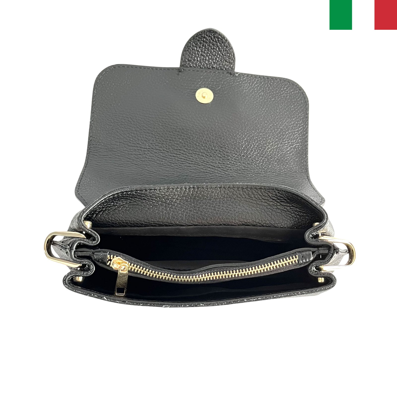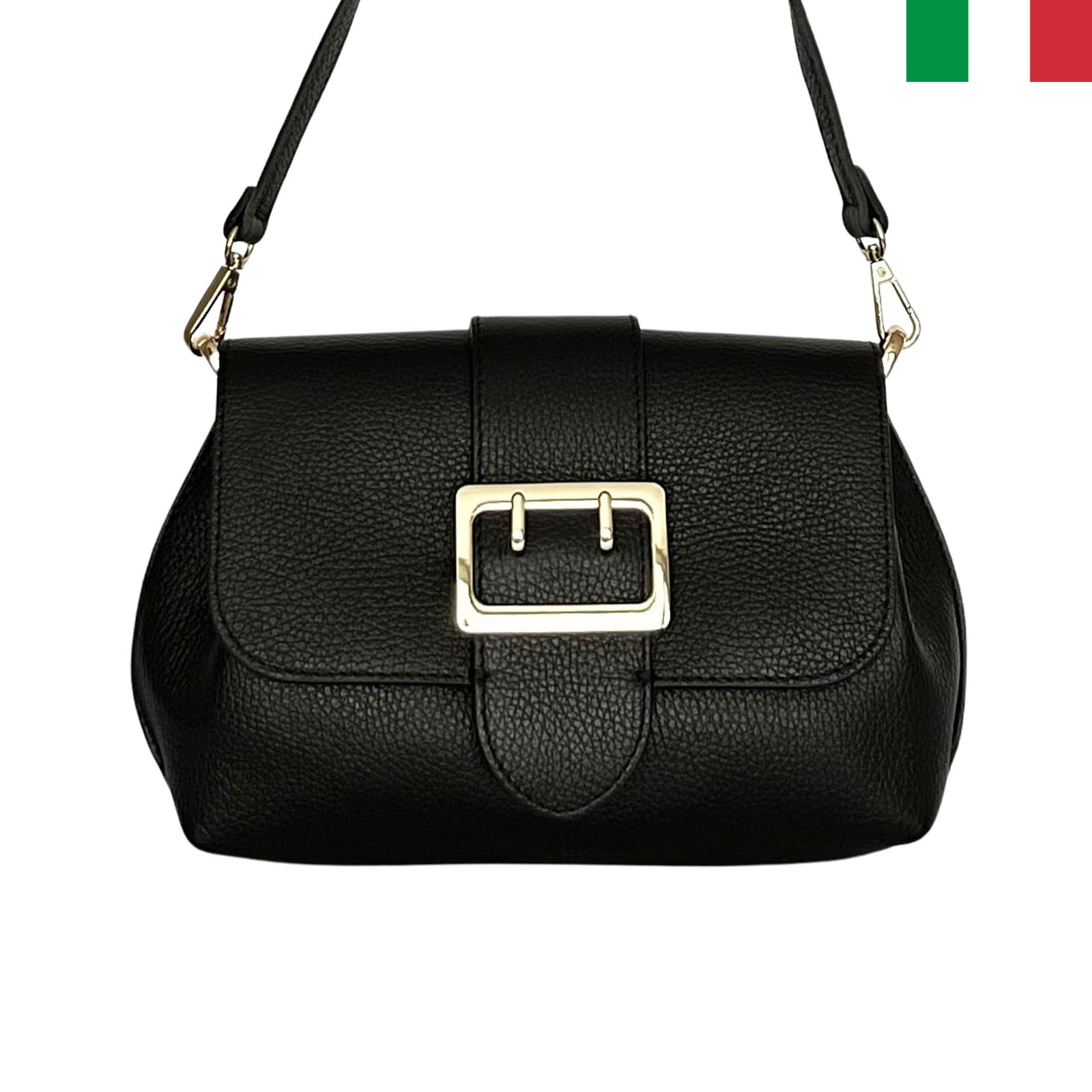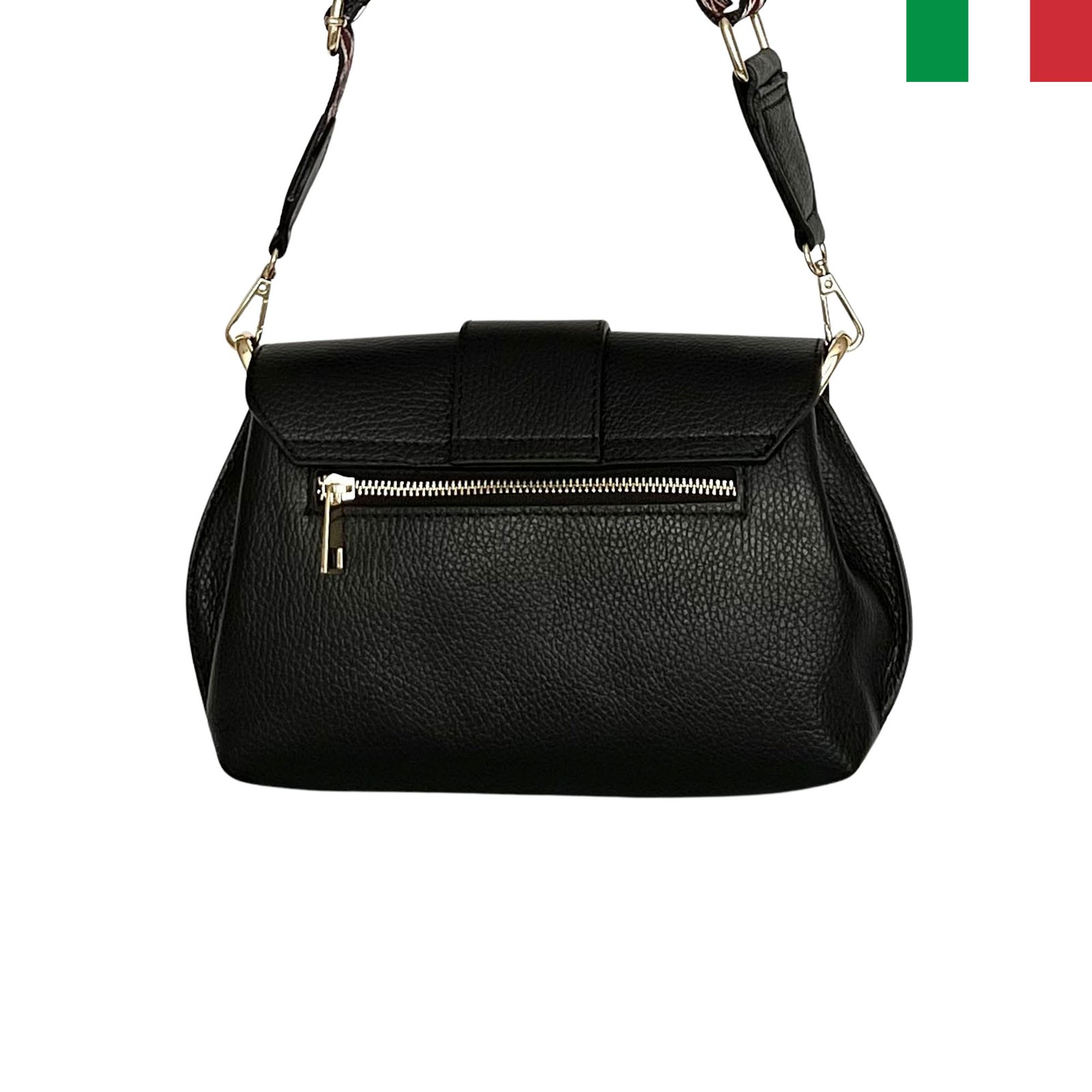 Дамска чанта от естествена кожа с катарама на капака и два вида дръжки – черен