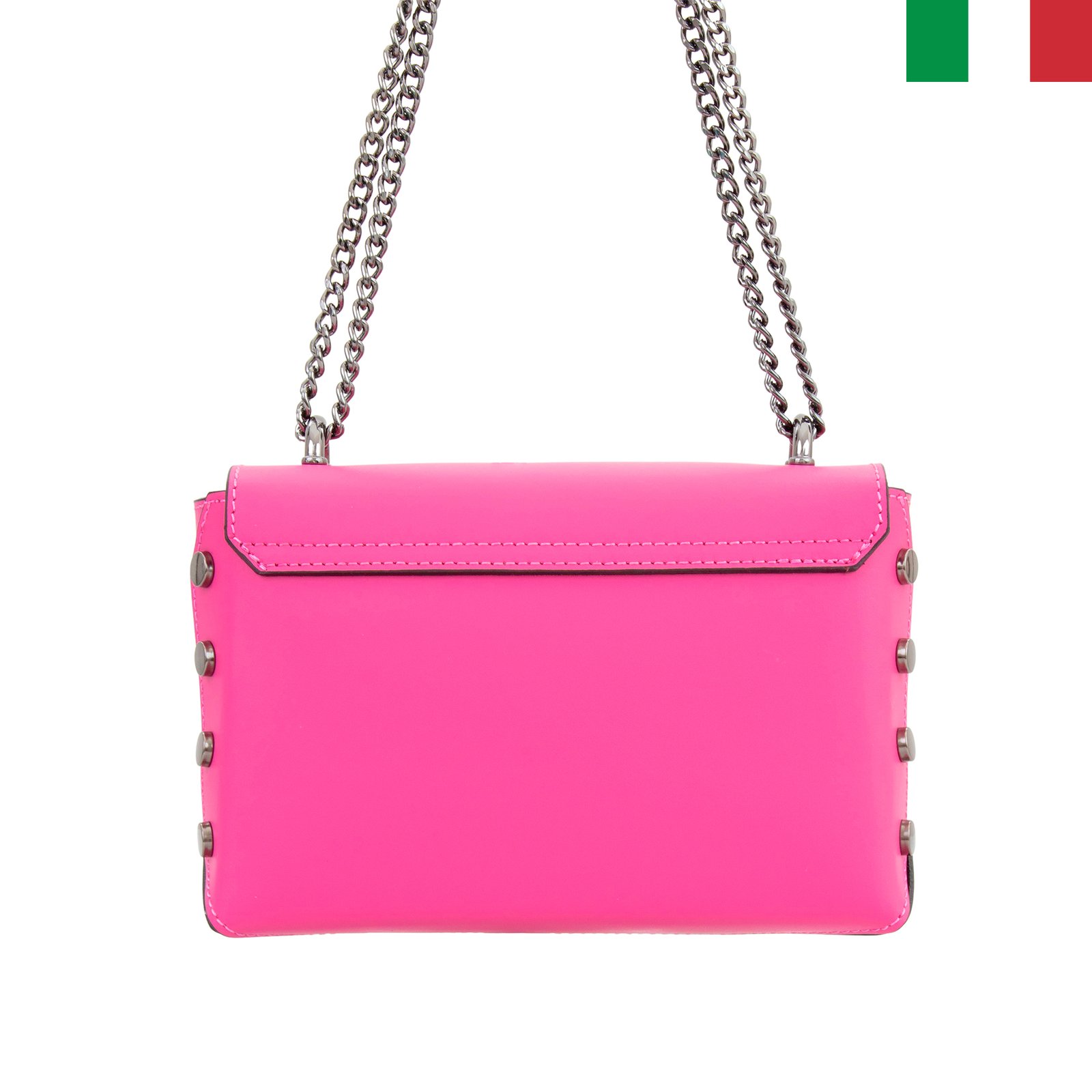• Чантата е изработена от висококачествена естествена кожа, в Италия. Актуален дизайн, стилна и същевременно модерна визия. Чантата е твърда с капси и интересно закопчаване. Синджирената дръжка допълва модерната визия, дръжката може да се издърпа максимално и да се носи с дълга дръжка настрани до тялото  или да се издърпат двата края и да се получи по-къса дръжка, за да се   носи на рамо.